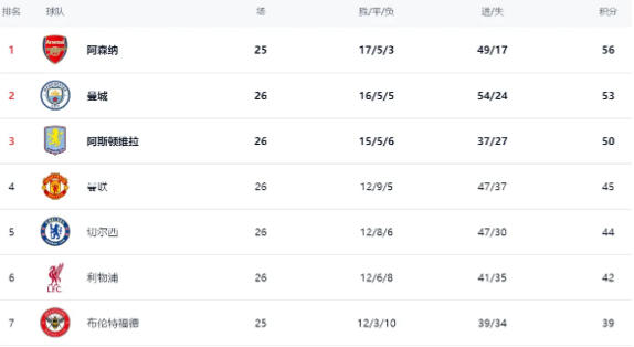 曼城贏球之后,繼續(xù)緊追阿森納,只落后阿森納3分,屈居第2。不過(guò),曼城比阿森納多踢了1場(chǎng)比賽,這意味著他們?cè)诤竺娴谋荣愔行枰优Γ拍芸s小差距或者實(shí)現(xiàn)反超。同樣贏球的阿斯頓維拉拿到50分,排名第3,他們雖然理論上還有沖擊冠軍的希望,但難度也不小。